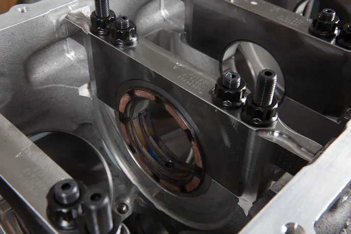The last piece of the rotating assembly, an octet of Manley’s LS pistons (PN 596065C-8) designed for the engine, use a -20cc dish and 1.065-inch compression height. The pistons use a low-drag 1.5 mm/1.5 mm/3.0 mm ring pack, and the top ring is .250-inch down from the piston top to reduce the chances of overheating the ring face in boosted applications. They’re built from 2618 alloy and use a .030-inch offset pin location to aid in reducing startup noise, which mimics the factory design. A set of premium chromoly .927-inch pins are included with the kit.