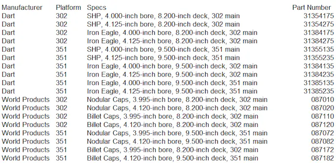 Failures develop because the material is thin and the block lacks features needed for increased cylinder pressure and RPM. The small two-bolt main caps are weak and tend to walk (a term used to describe movement) and that can eat bearings and create vibration and harmonics that leads to cracks. Furthermore, these blocks have trouble maintaining cylinder head sealing, especially in boosted applications due to the small head bolts and thin deck surface.It’s difficult to win a race or a championship with a broken engine–above all, racers need durability. This durability comes from a rock-solid design and these blocks from Dart and World have added strength while retaining Windsor architecture in regards to bore centers, bellhousing bolt location, engine mounts, head bolts, oil pan, and other fastener locations. Great care has been taken to fortify these blocks by using superior iron alloys for strength, combined with more material added to critical areas that are prone to failure in stock applications.