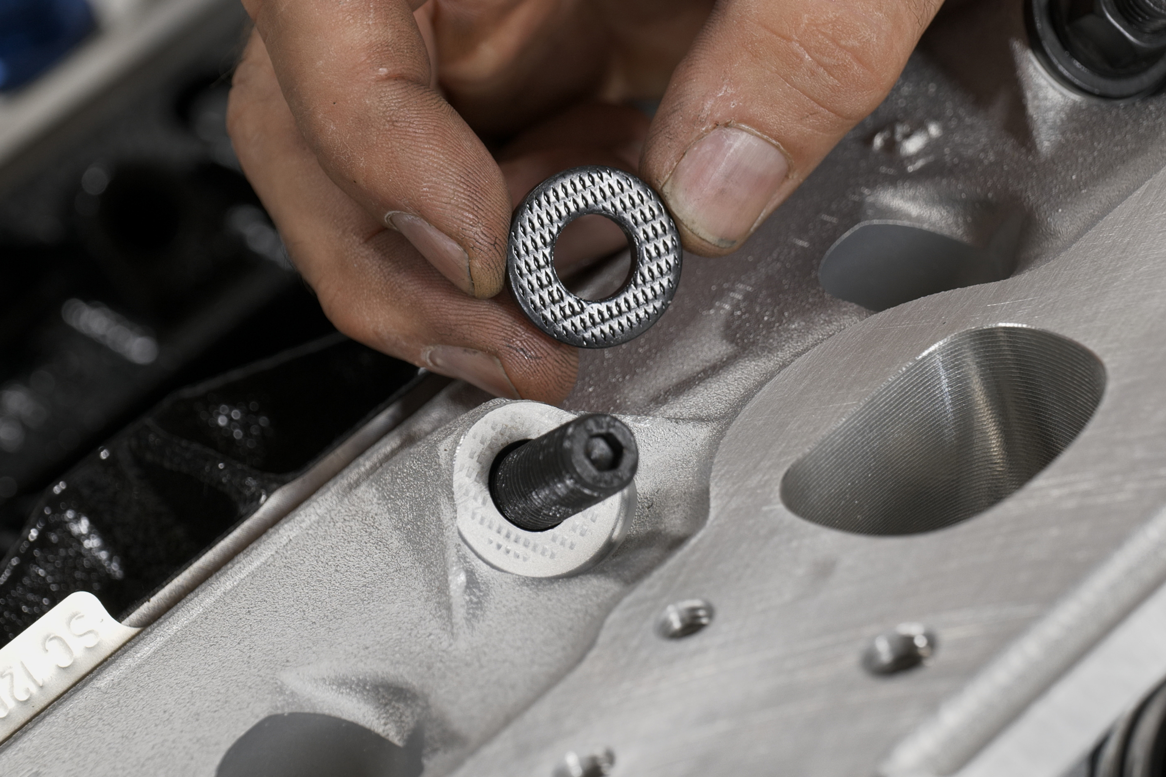 ARP’s solution to this problem was to create a special washer called a “Cat Paw” that had enough grip on the cylinder head to stop it from spinning, but not so much that it generates falsely high torque readings. The engineers discovered that by adding a shallow, recessed impression on the washer surface, it had just enough grip to grab the cylinder head clamping surface, but not too much. The bolt head spins on the washer, and the washer bites into the aluminum just enough to hold fast.