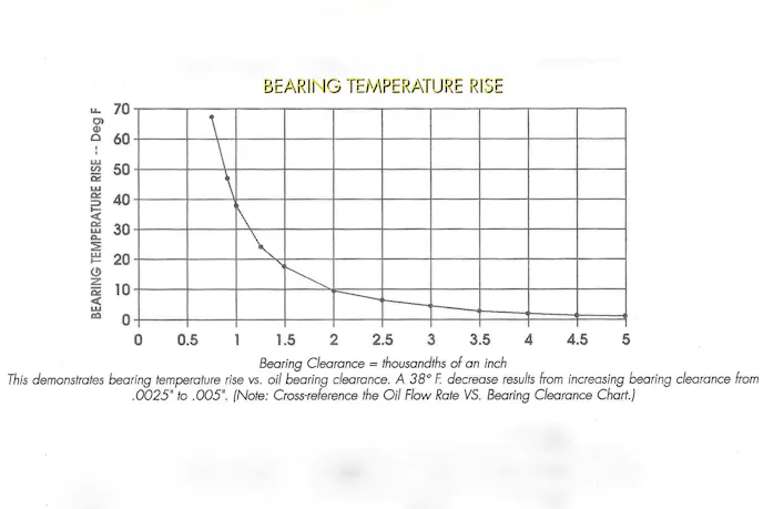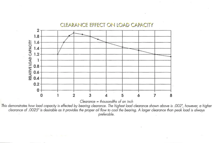 This fits right in with the now-common approach of reducing rod journal size to slow bearing speed. The most popular small rod bearing journal diameter now is 1.850-inch, down from the Honda 1.88-inch bearing. This also means the bearing clearance will be quite tight at perhaps 0.0015-inch or less and used with extremely light viscosity oil such as 0w20 or even 0 weight oil. We have reproduced three graphs from an old Callies Crankshaft catalog that shows how tighter bearing clearances increase load carrying capacity yet reduce flow. This flow is also affected by oil temperature, with tighter clearances causing a higher oil temperature. This is one reason why thin oil is necessary. In the ‘60s and ‘70s, engine builders did the opposite, using wider oil clearances and heavy 20w50 oil.