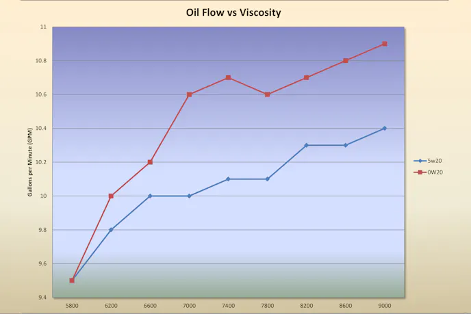 Let’s start by examining the oil-flow path through an engine. The oil pump moves a given amount of oil based on its capacity and the speed at which it is operated. Pumps don’t make pressure. Instead, they move a given volume of fluid with pressure created by restrictions in the lubrication path. These restrictions reduce the volume. The best way to understand this is with the classic garden hose flow example. When the tap is opened, water escapes the end of the hose at a given flow rate. This rate can be expressed as gallons per hour (gph). If you restrict the hose outlet with your thumb, the pressure in the hose increases while the flow volume decreases exiting the hose.