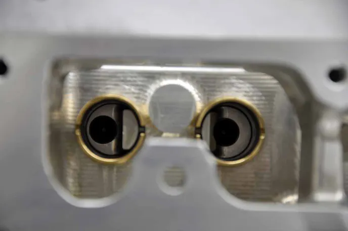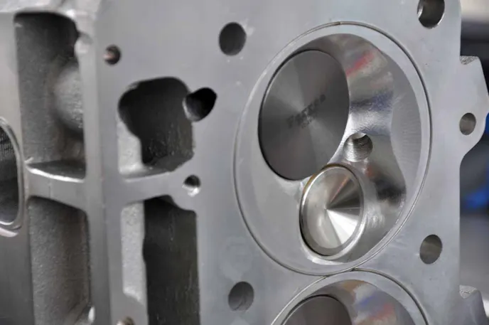 The combustion chamber softening can be seen here; it's the shallow hemispherical cut from the outer edges of the bore towards the combustion chamber's roof. Titanium Ferrea intake and exhaust valves