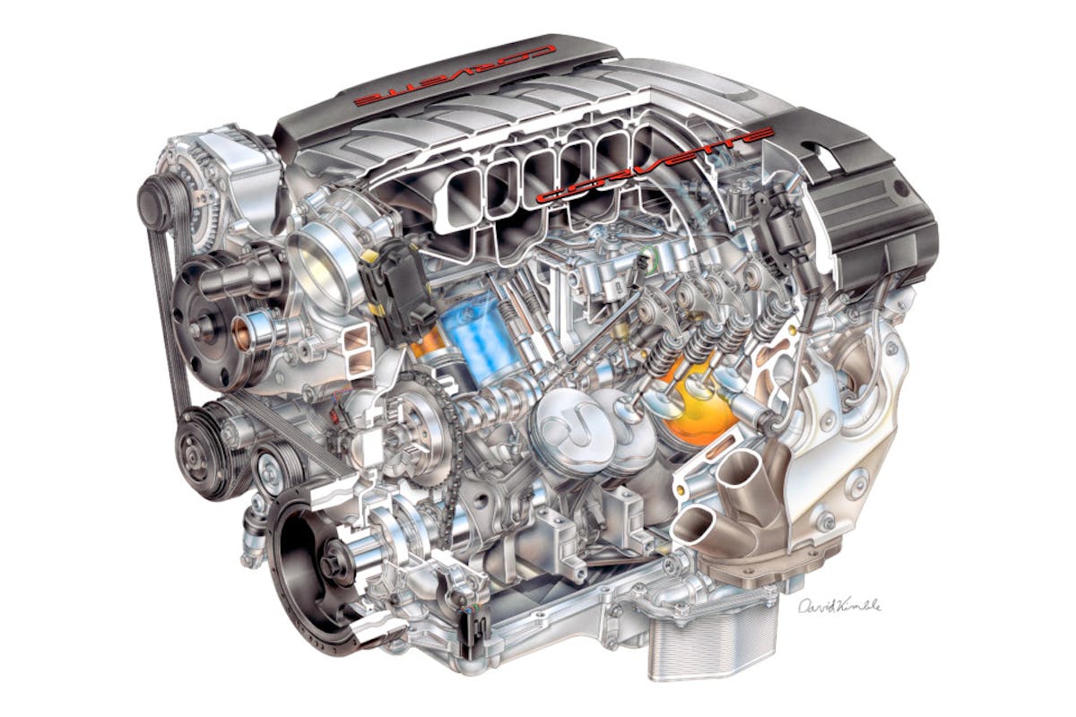 This excellent cutaway drawing by David Kimble of the LT1 Corvette engine illustrates the gasoline direct injection position along with a peek into the VVT hardware. Both DI and VVT, but not AFM (a.k.a. DOD)will be employed on the new L8T engine.