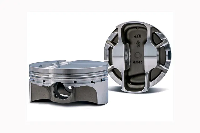 JE asymmetrical pistons use a forged-side-relief design (FSR) with major and minor thrust skirts, inboard pin bosses and a shorter and stiffer wrist pin. Over the years, the skirt designs were tweaked, sometimes significantly, as designers refined their function according to changing performance requirements. The primary focus of the asymmetrical piston design is weight and friction reduction via the FSR’s smaller, lighter skirt on the minor thrust side. A key design benefits of the asymmetrical piston is the shorter and lighter piston pin. On a Chevy LS engine, the piston pins are only 2.250 inches long, reducing piston weight by up to 10 grams.