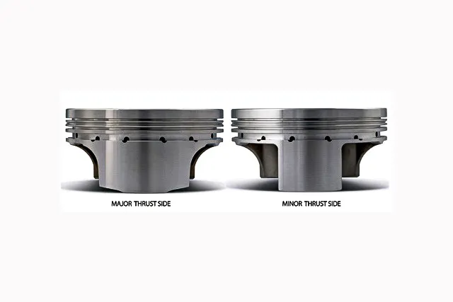 Asymmetrical pistons provide a unique way of reducing friction and piston weight by making the skirt on the minor thrust side smaller than the skirt on the major thrust side. The major thrust side of an asymmetrical piston is a full-sized skit designed with optimum load bearing and friction characteristics. The minor thrust side still requires a skirt for stability, but it can be smaller because that side sees less thrust loading.