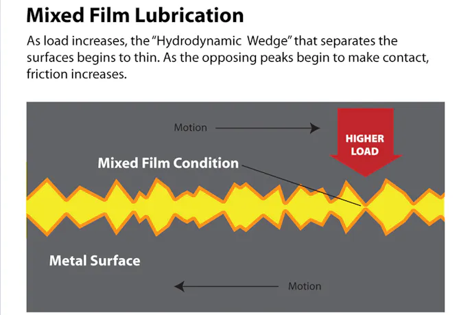 The concern is that this higher temperature will create a slightly thinner oil film and the components may touch, causing what is called mixed film lubrication. That is where the microscopic high points of the bearing and crankshaft main journal, for example, will touch each other, creating wear. This will show up as scratches or gouges in the bearing material.