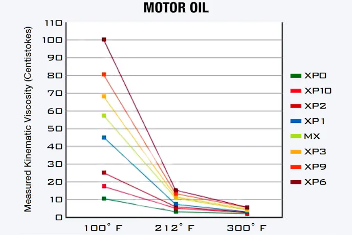 We’ve included a graph from Driven Racing Oil that shows how oil thins in direct proportion to its operating temperature. For a performance engine operating at peak power, the average sump oil temperature may only be 200 degrees-Fahrenheit, but at the bearing, actual temperatures will be much higher.