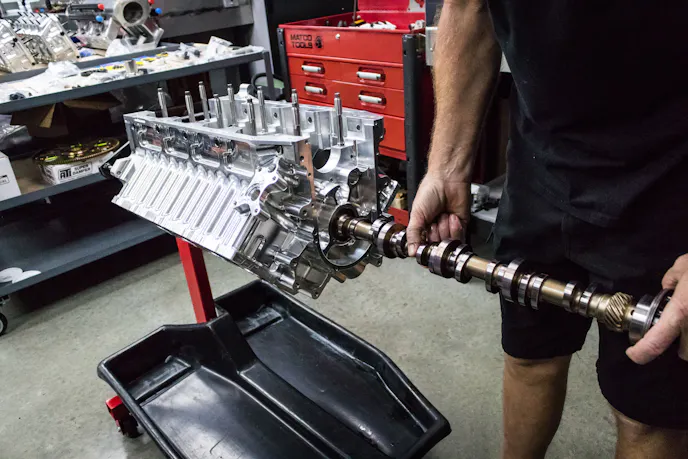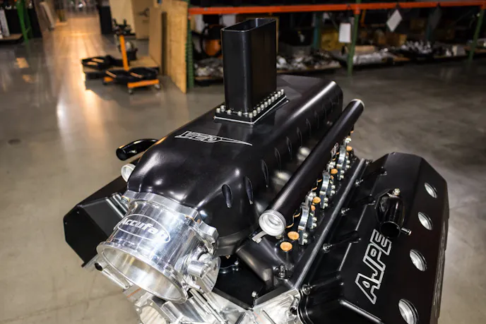 Front-and-center up top on this engine are a set of Alan Johnson Performance Engineering’s P8 Hemi cylinder heads.