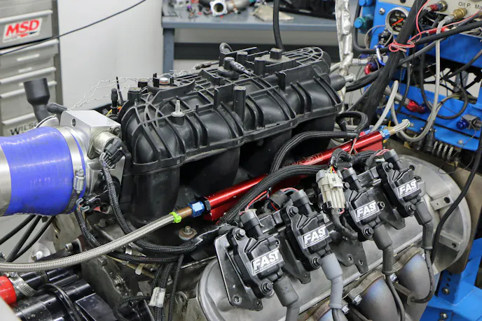 Also used in the setup were a set of FAST 89lb/hr injectors, a FAST 92-mm throttle body, and Holley HP engine management system. Feeding boost to the 5.3L was a single Precision 7675 turbocharger. A ProCharger air-to-water intercooler kept the IATs in check, and a single Turbosmart Hypergate45 wastegate managed boost levels.