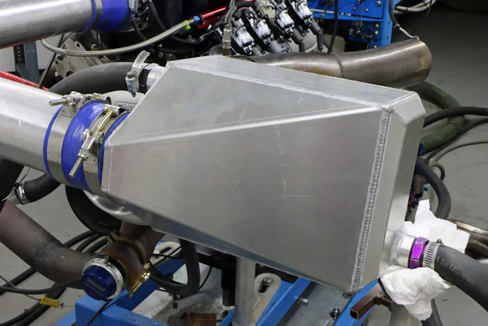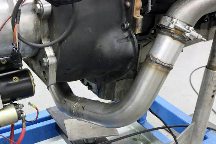 In addition to the flange, the Y-pipe also featured provisions for a pair of Turbosmart wastegates and a fitting to allow measurement of pre-turbo exhaust backpressure. We drilled and tapped the 90-degree turbo flange used on the Hooker system to monitor backpressure as well. Now, all we had to do was run the two systems at the same boost level and measure any difference in back pressure and power.