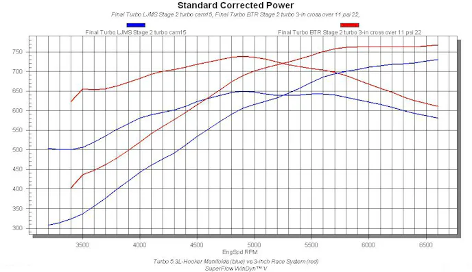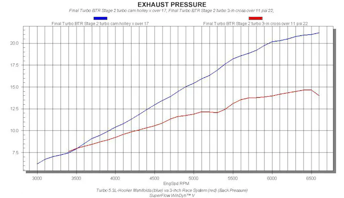 Looking at the difference in power at a point where the two systems had identical boost levels, air/fuel ratios, and timing gives us a better look at the real story. Measured at 6,100 rpm, the power difference between the two systems was 47 horsepower.No doubt caused by the more than 6-psi difference in exhaust backpressure (14.2 psi for the tubular headers vs. 20.3 psi for the cast manifolds).