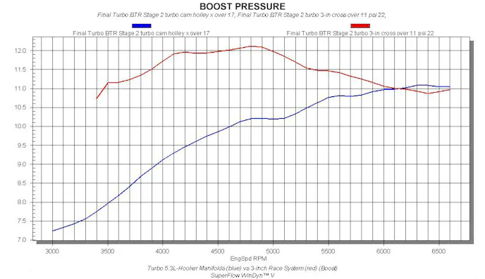 That means there was no way (short of possibly an electronic wastegate) to match the boost curves of these two combinations. Instead, we were forced to match boost and backpressure at a specific engine speed.