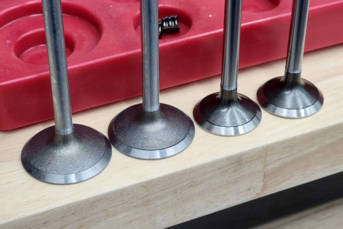 The first parts we installed were brand-new valves. The OEM intake valve (P/N: V1709) is a 7mm stem, 5.337-inch overall length steel valve with a 37mm (1.457 inch) head on it, with a 45-degree seat angle. Due to the design of the cylinder heads, the stainless steel exhaust valve (P/N V1908) is noticeably shorter, at 4.579 inches overall length, but with the same 7mm stem diameter. The head size for the exhaust valve is 30mm (1.181 inches) with the same 45-degree seat angle.