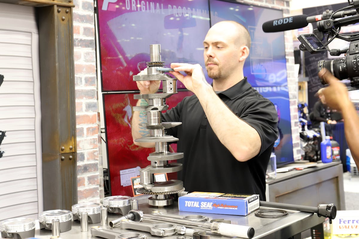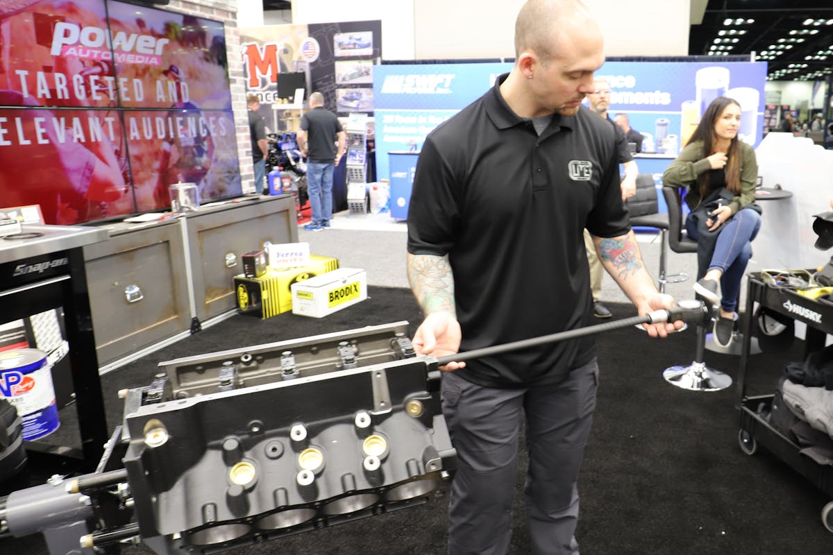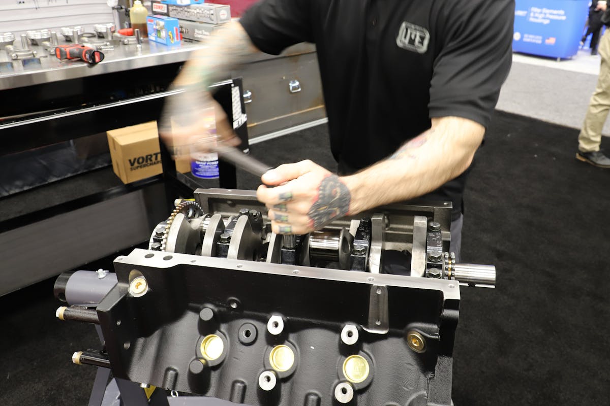 LME did all the machine work to prep the block — including CNC deck surfacing, align honing, and finishing the bores at 4.125 inches — prior to the show. At the show, LME’s rockstar engine-builder, Vinnie Monighetti, made short work of the assembly. Starting off with dropping a set of coated Clevite bearings into the mains, Monighetti then grabbed the crank before torquing the ARP main stud kit.