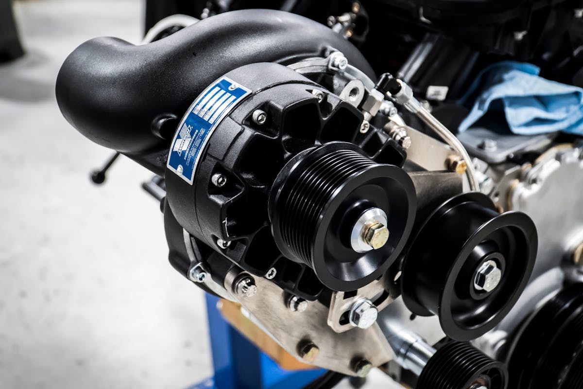 Additionally, Celeste opted for a C5/C6 Corvette Front Engine Accessory Drive, which keeps the supercharger in about the same location as the 105A setup, but flips the blower around and tucks it in behind the front line of the engine. This necessitates the use of a reverse-rotation blower, and allows for a factory-style 10-rib serpentine belt setup to drive not only the blower but all of the engine accessories.