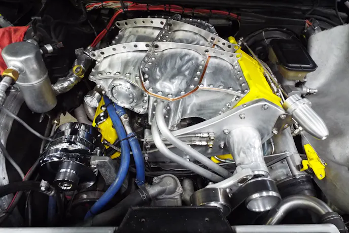 Starting with a “512” casting block, Daly had it converted to four-bolt main caps. A balanced Lunati Pro Mod reciprocating assembly includes 8.75:1-compression ratio pistons (which spec out to closer to 9:1 with his heads). The camshaft is a .680-inch lift intake, .695-inch exhaust, 112-degree LSA solid-roller. The top-end includes rectangular-port, open-chamber heads with .100-inch-longer valves and titanium retainers.