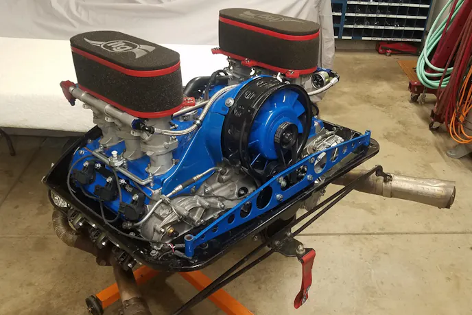 The engine received new head studs, Nikasil-lined cylinders, JE 11.5:1-compression ratio pistons, Pauter Rods, and Borla 46 mm individual throttle bodies with 36-lb/hr high-impedance injectors. Porsche Carrera tensioners and serpentine belt drive were used, along with a twin-coil-on-plug ignition, and an Electromotive TEC3 GT engine management system.