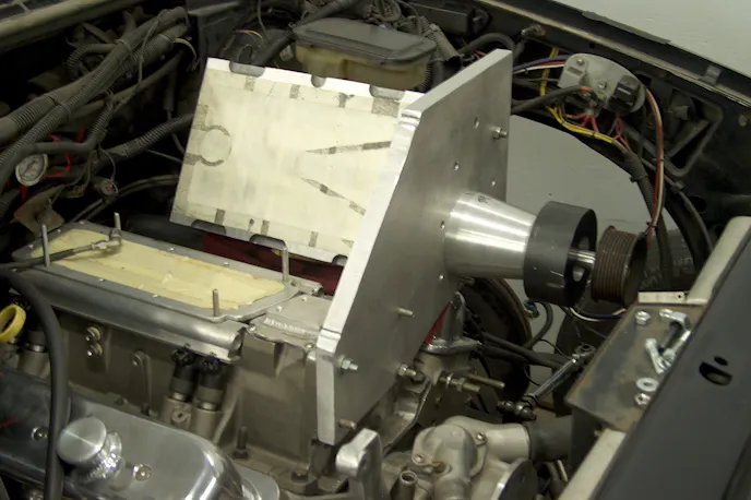 “The new snout was made on the lathe and the mill, and uses the same internal components, bearings, and seals as the original,” he says. “The drive pulley’s diameters were decided by what others had done to get 9.5 pounds of boost. A machinist friend made an adapter to mount the 8-inch lower pulley (bought aftermarket for a Lightning) to a Fluidampr harmonic balancer.”