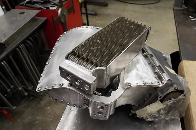 Turning to his IndyCar experience, Dreisbach made a heat exchanger core from a high-fin-density Marston core that was originally part of a 1996 Lola ChampCar engine radiator. “It was made to be a double-pass cooler, and it has aerodynamic tanks for better airflow. Also, there is a reservoir that holds a stock Lightning intercooler pump that is low in front of the left front tire with a titanium stone shield.”