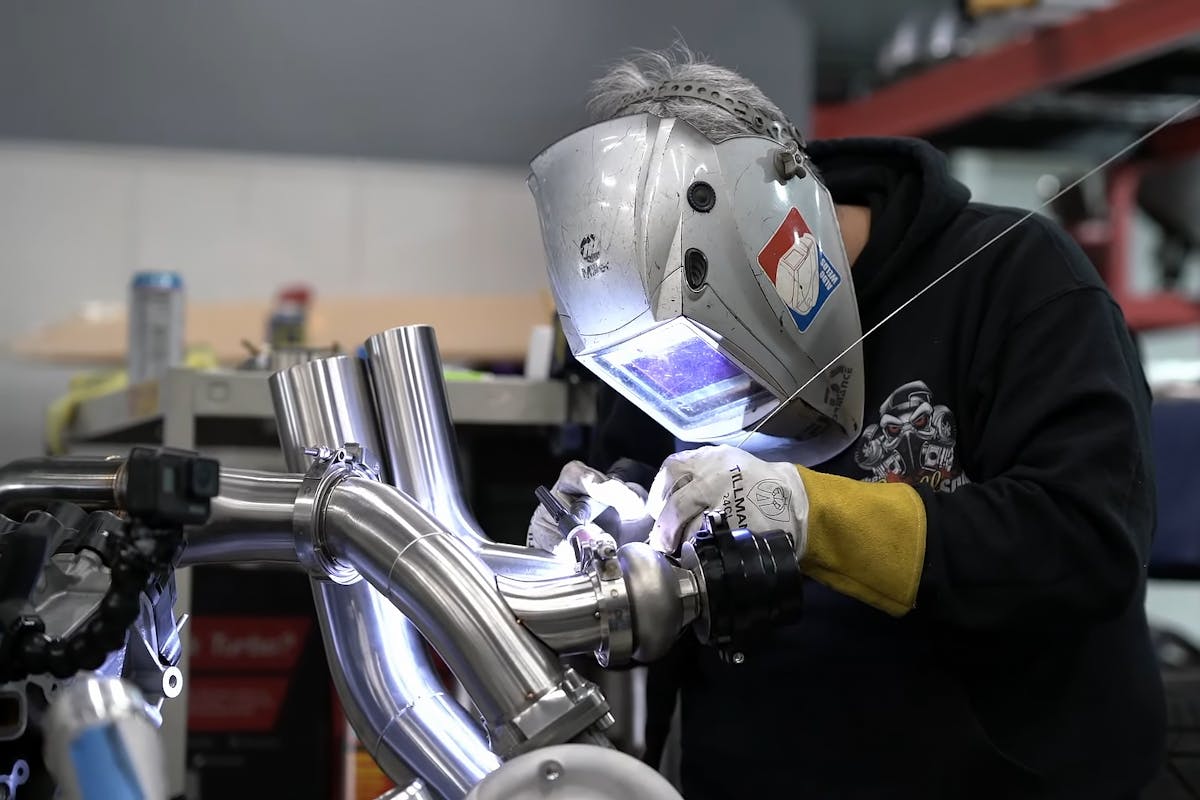 In order to provide Aldo with a great base to start his custom design from, we reached out to Kooks Custom Headers. They designed a set of forward-facing upward-swept manifolds for the Godzilla that Aldo could build off of. Made of 14-gauge 304 stainless steel tubing merging into a 3.00-inch V-band discharge flange, the manifolds use a 3/8-inch-thick stainless steel flange for secure sealing under high temps.