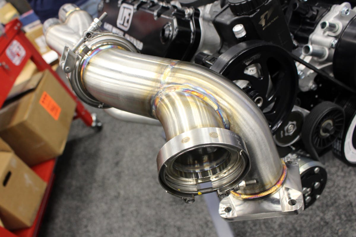 Kooks also provided all of the 304 stainless steel tubing for Aldo to work his magic with. Funneling a 3-inch tube into the turbocharger, Aldo created a 3.5-inch expander on the turbocharger outlet, to feed into 3.5-inch vertical exhaust tubing. The wastegates were plumbed with 3-inch offshoots from the main exhaust tube, and 2.5-inch screamer pipes on the wastegate outlet.
