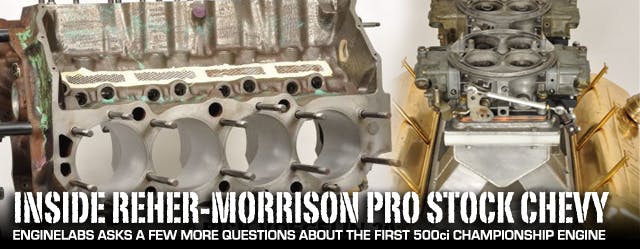 big-block Chevy built by Reher-Morrison Racing Engines that powered Lee Shepherd’s second- and third-generation Camaros to the respective NHRA Pro Stock titles in 1982 and 1983. In addition, the one-of-a-kind, radically machined cylinder heads were swapped onto a 615ci engine to win the 1983 IHRA Pro Stock crown.