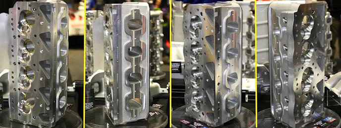 With the symmetrical design, the valve centers are rotated around the bore center from conventional configurations. This allows less rocker-arm offset to improve valvetrain stability. The heads can be ordered with either 11- or 14-degree valve angles and 2.50- or 2.56-inch intake valves. Exhaust valves are 1.82-inch.