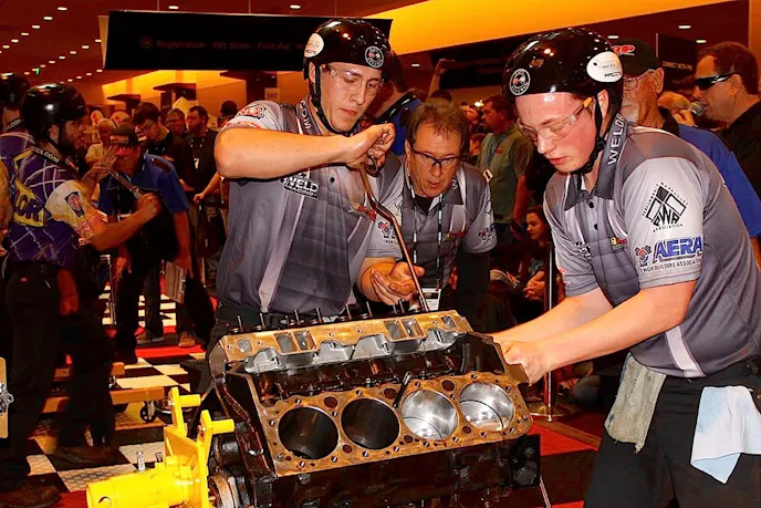 The Hot Rodders of Tomorrow challenge is somewhat similar to action in the pit between Top Fuel rounds at a drag race. There are three identically prepared small-block Chevys positioned in front of the work benches dedicated to each team. The students must disassemble the engines, using only hand tools and proper de-torquing procedures. When given the go-ahead by the judges, the teams then re-assemble the engines. Rules spell out correct procedures and torque numbers. Teams can also be penalized for dropping parts or any action deemed unsportsmanlike. The team with the fastest overall time wins. Numerous aftermarket companies support the teams with uniforms with other endorsements, and the top finishers earn scholarships to further their automotive ambitions.