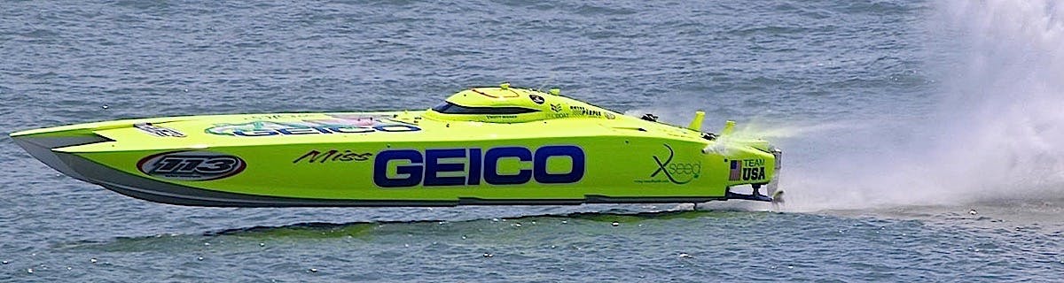 Miss Geico is a 50-foot Victory catamaran made of carbon fiber, Kevlar and S-glass and is capable of 200 mph or faster with the twin Mercury engines and BPM drives.