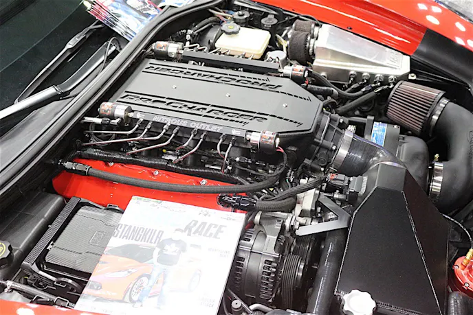 “We have a few cars that are going to be making some noise soon, one of them is this red Corvette of Justin Keith from Streetcar Takeover. It’s a C7 with a 427 ERL motor, it still has the factory heads but it’s got our o-ring system, anytime you go over 1,300 horsepower it’s a must. It has all forged internals, a dry sleeve setup and a superdeck setup,” Vivanco explained.