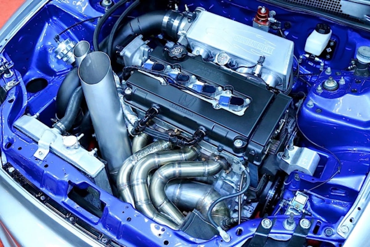 Other features include TiAl blow-off valve and wastegate, Skunk2 90 mm throttle body and SouthBay 2,200 cc fuel injectors. Controlling the fuel and spark is a Hondata S300v3.