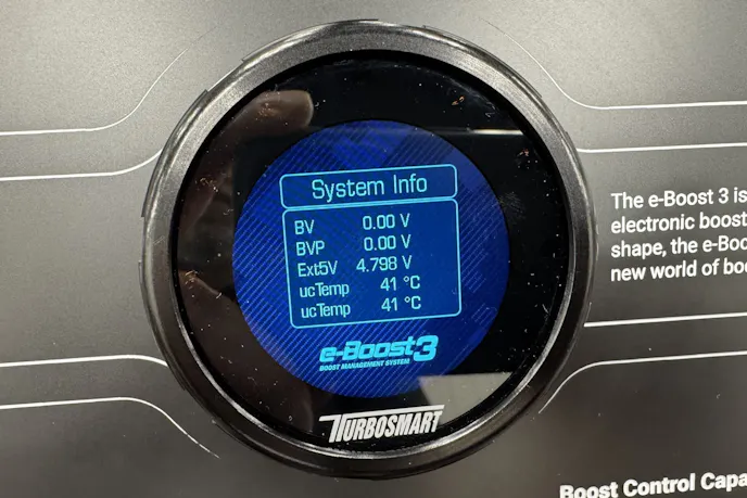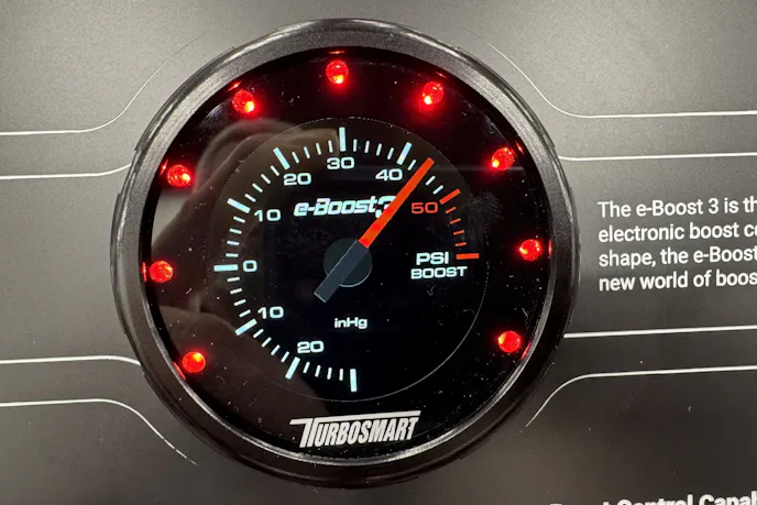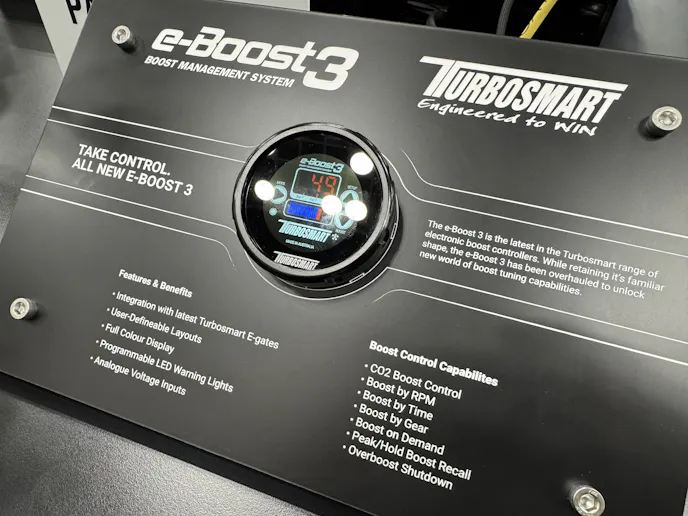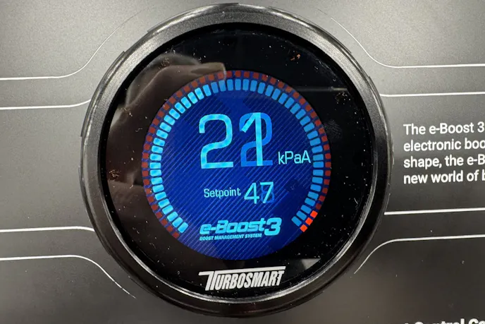 Turbosmart delivered with the new eBoost3, which is capable of commanding a single solenoid, twin solenoids, CO2, or electronic wastegates. It has a 60 psi onboard boost pressure sensor, and is compatible with any “market-leading pressure sensor” for higher boost applications. The eBoost3 features a full-color LCD, a rotating click bezel for on-the-fly adjustments, and many boost control options: