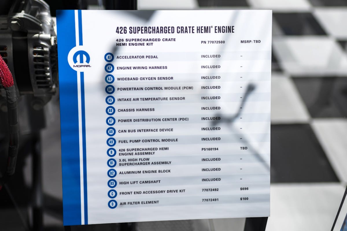 The engine assembly comes with everything the engine needs to run, including the water pump, oil pan, flywheel, supercharger and throttle body, fuel injectors, and coil packs. If you’re looking for a plug-and-play kit to control the engine, Mopar has that covered, as well.