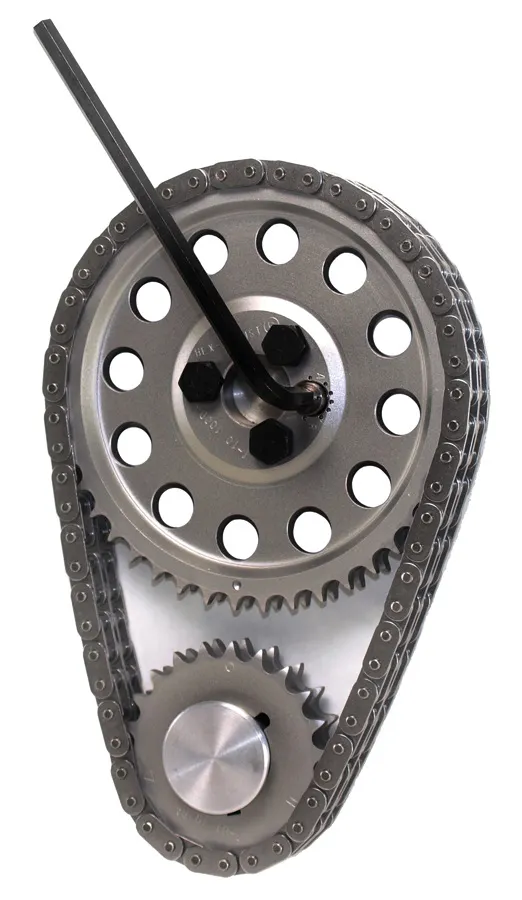 Thompson: We have seen improvements with additional options of billet steel sprockets, adjustability and — in our case — patented tooth profiles. No improvement has had greater impact than the adjustability features. Multiple keyway crank sprockets (see below) first allowed valve timing adjustment in two-degree increments. And then the introduction of the Hex-A-Just offered infinite adjustability at the cam sprocket without having to disassemble the timing set. The continued development of the adjustable cam sprocket focuses on the idea of a one-piece design, with infinite adjustability using the existing attachment bolts for their joint security.