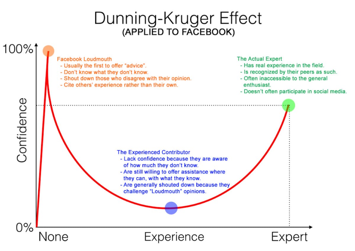 Now think about your favorite Facebook group, and how those points might apply to the most active posters in those groups. Typically, those who shout the most, often have the least-valuable input. And those who don’t say much at all often have the best information to share. In psychology, this is called the Dunning-Kruger Effect, which effectively proves out how people mistakenly assess their abilities as much greater than they are—being ignorant of one’s own ignorance. In other words, they don’t know what they don’t know.