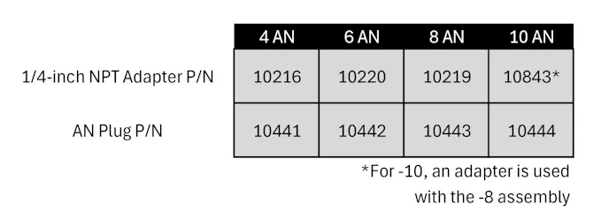 The key to these testers, in our opinion, is the 1/4-inch NPT male to AN fitting. 1/4-inch NPT is an extremely common air compressor size, and surprisingly, the AN-specific conversion fittings are quite affordable. Since proper assembly of the NPT fittings into an air hose quick disconnect fitting requires Teflon pipe tape, we decided that we should get a separate air hose fitting for each size adapter, and keep them permanently mated.