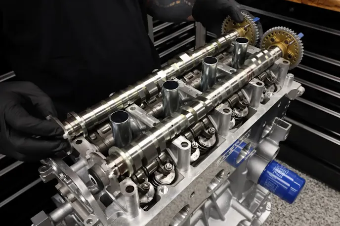 Once the valves are installed, each port is pressure tested to verify the seal. A copper head gasket goes down over the K24’s fire rings on each cylinder, then the head studs are installed before the head is lowered onto the block and torqued. Next, the valvetrain is loaded onto the head. Before tightening the cam caps, each rocker arm adjuster is fully loosened so that there is zero load on any lobe, ensuring accurate torque specs are reached. Each rocker is adjusted with feeler gauges. This is another precision measurement that should be done for all engine builds, but is absolutely critical at this level of performance.