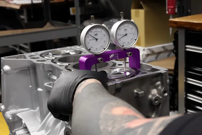 After assembling the K24 rotating assembly, each piston is checked for deck clearance, and the rods are measured for side clearance. While this is recommended for all builds, at this power level, the slightest amount of play or tightness matters to the ten-thousandth of an inch. The same level of detail runs throughout the build of this engine, as each moving part is assembled, it gets checked for clearance and performance. The timing chain is installed using three dial indicators to verify the cams are perfectly timed with the crank and each other; no eyeballing the timing marks here. Every valve spring is tested to ensure they all match and are then installed with a manual spring compressor.