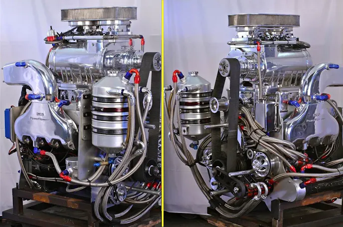 Fuel delivery is handled by an Autronic electronic fuel-injection setup and a pair of Accufab 4500 throttle bodies while spark is controlled by MSD. Other features include Barnes dry-sump oiling and IMCO water-jacketed exhaust.