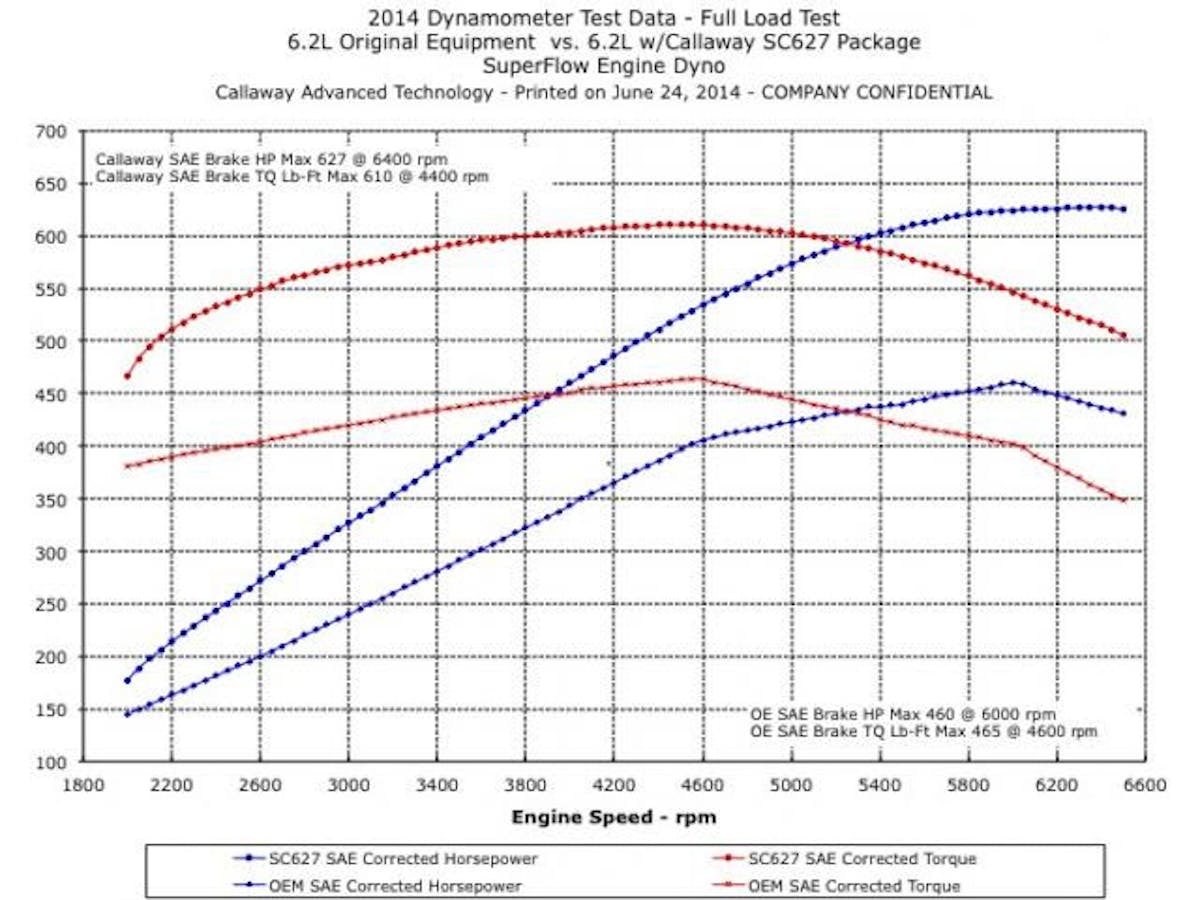 Their engineers have recently finalized the Callaway Corvette’s powertrain management system calibration after extensive testing. Using components that are production-level, the dynamometer shows 2014 Callaway Corvette final power figures of 627 horsepower at 6,400 rpm and 610 lb-ft of torque at 4,400 rpm. Horsepower is up by 167 over the stock LT1 engine figure of 460, and torque has been increased by 145 over the stock mark of 465 lb-ft.