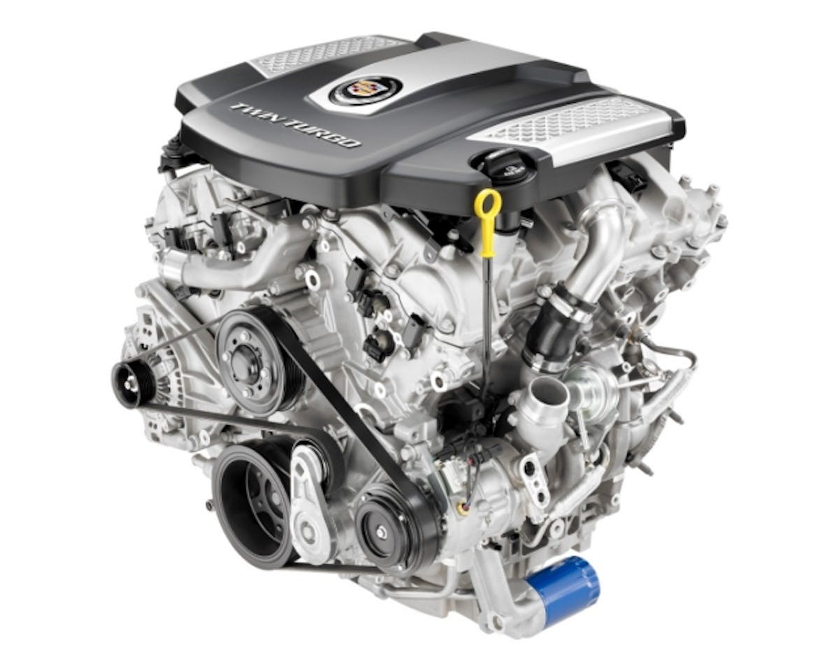 The twin-turbo is an upgrade of the 60-degree DOHC V6 offered in many of the current Cadillac models, but many components are completely new — such as the block casting. Other new parts include stronger connecting rods, polymer coated pistons with a steel top ring carrier, new charge-air cooler, vacuum-actuated wastegates and new direct-injection system. The turbos are good for 12 pounds of boost, and the engine sports a 10.2:1 compression ratio.