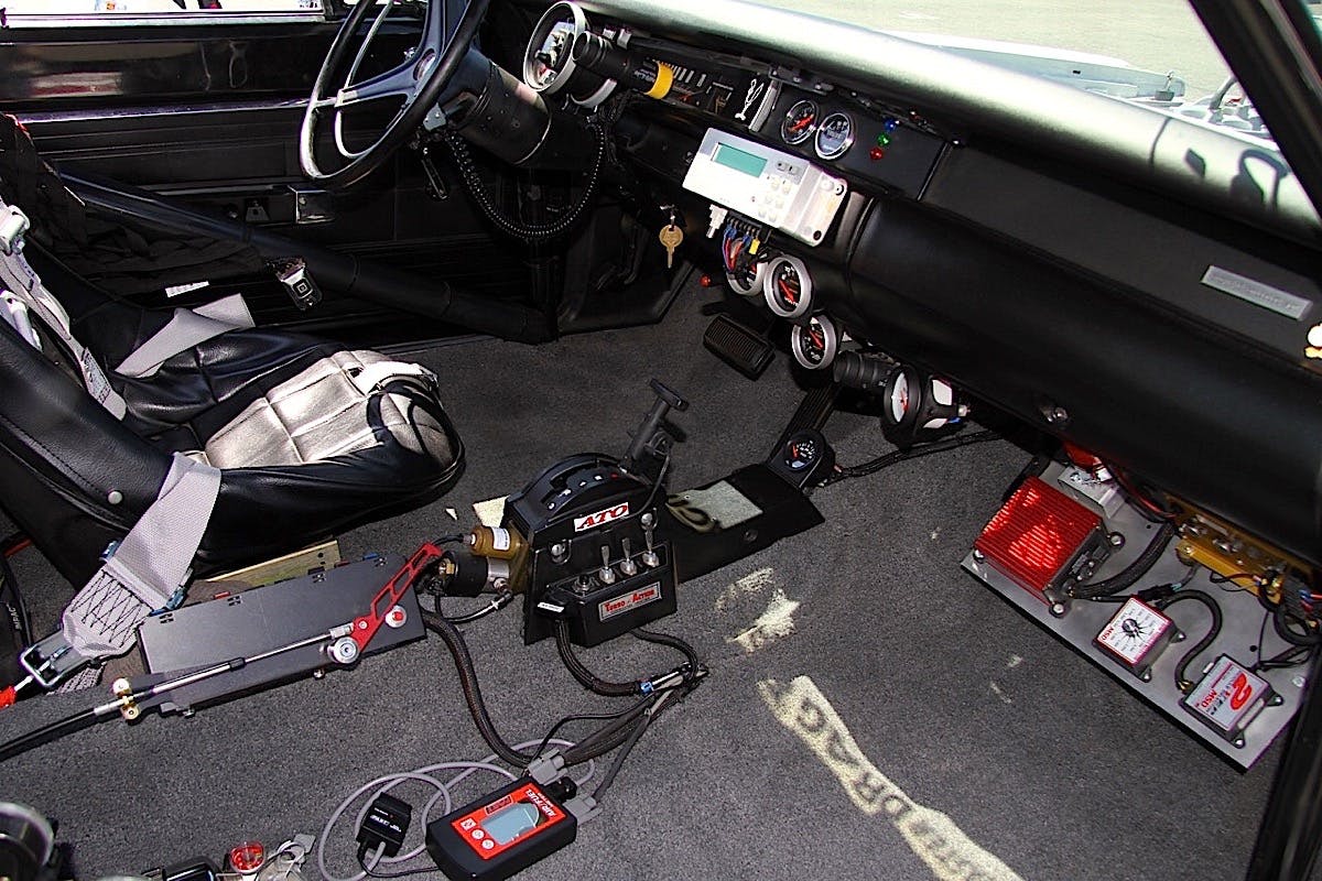 The engine build started with a Mopar Mega Block and bolted in a K1/Wiseco rotating assembly (4.375 x 4.500). Shaw says he likes the iron block up front since the car normally pulls healthy wheelstands on a decent track. The Indy “Little Easy” EZ cylinder heads feature 295cc intake ports, 2.19/1.81 valves and Harland Sharp 1.6:1 rockers. On top is an Indy intake manifold and Holley Dominator 1150 carb. Spark is provided by MSD while Milodon handles the oil flow and Moroso takes car of the water flow. Shaw had Comp Cams grind a special bumpstick for this engine to keep the torque way down low.