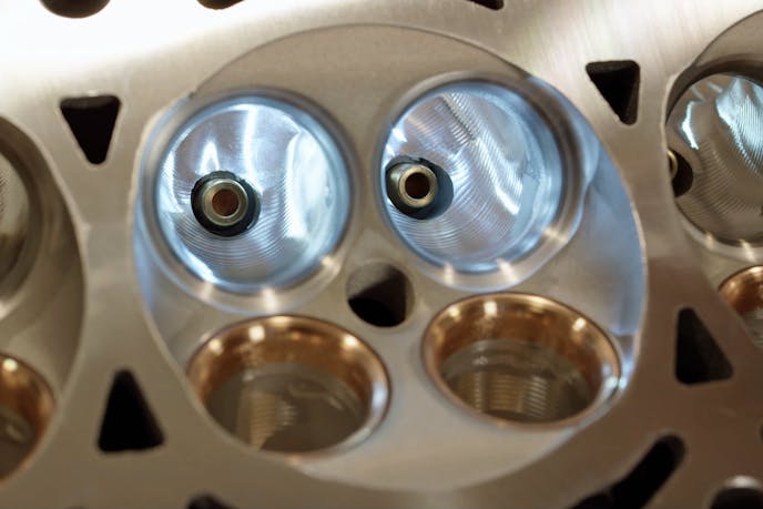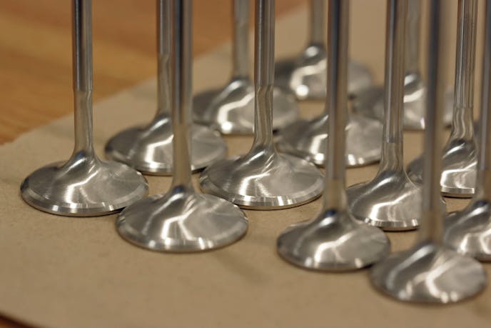 In the chamber, new valve seats are installed and finished with a 45-degree valve job for the 1mm oversize intake valves. Ferrea Super Alloy valves are utilized to be able to handle the extreme heat encountered in the turbocharged application, with 36mm (1.417-inch) intake and 30mm (1.181-inch) exhaust valves used. To control those valves, Ferrea valvesprings are used, combined with titanium retainers to be able to handle the 9,000-plus rpm the engine will turn.