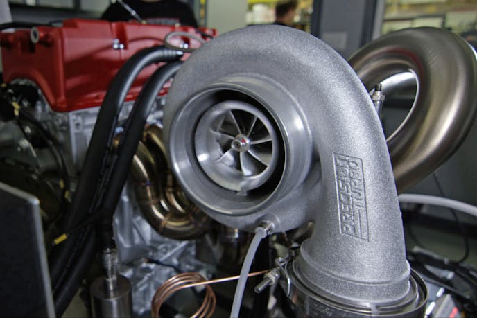 The bell of the ball, and the source of boost, is a Precision Turbo PT 7285 CEA turbocharger. The 72mm CEA compressor wheel is machined from a 2618 aluminum forging, and an air-cooled dual ceramic ball bearing center housing offers extremely high efficiency and fast transient response. “It’s a big turbo, but, this engine is a big displacement engine. It can handle it,” Wilson says.