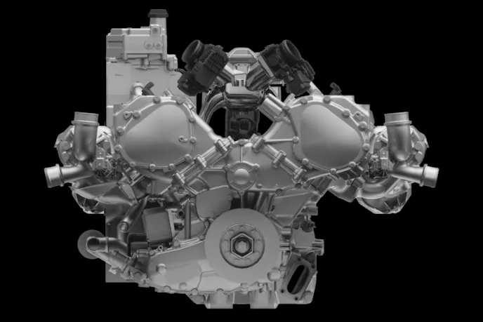 The size of each of the single-scroll turbochargers isn’t noted anywhere, officially, but if we had to make a guess based on a part number and some quick cocktail-napkin math, we’d wager they are in the 58mm range. The turbos are electronically gated to 15.4psi maximum manifold pressure, and the engine also features a six-rotor dry-sump oiling system with segregated scavenge areas for maximum performance in all conditions.