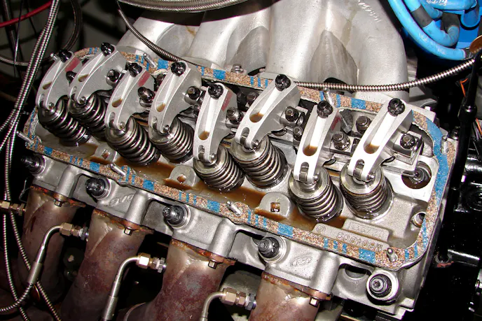 Coated Clevite rod and main bearings are used in the rotating assembly, and a Roush-Yates Racing five stage dry-sump pump provides four scavenging stages and one pressure stage. A Roush stainless steel dry-sump oil pan with three scavenging pickups compliments the pump, and a Cloyes double-roller timing set keeps everything in time.