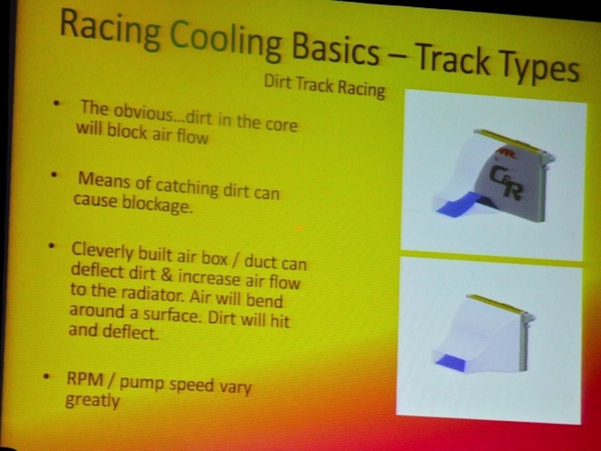 Paulsen talked extensively about spec’ing out a radiator. A number of factors come into play, including type of track, vehicle speed, on- and off-throttle times and potential for debris in addition to typical engine data.