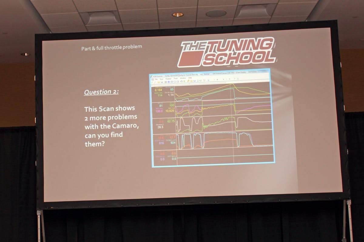 He displayed scanner results on the projector that showed the vehicle with a terrible MAP reading, pointing toward a large vacuum leak, a mechanical problem that needed to be corrected before the tuning process could continue.
