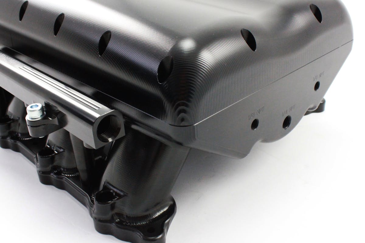 The final product has a wide variety of options available to the end user. Available with the standard eight-injector configuration, Plazmaman offers a sixteen-injector option, for really high-horsepower applications. There are four throttle-body options offered, including the OEM 90mm drive-by-wire, a 102mm LS-style drive-by-wire, and then two mechanical-cable-actuated 100mm in-house Plazmaman throttle-bodies with two different cable clamp styles.