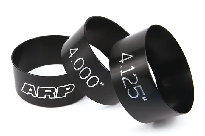 Engine builders now have 127 different sized Tapered Ring Compressors to choose from in ARP’s extensive collection. The expanded selection ranges from 3.552” to 4.750” and 75mm to 100mm on the Metric side. These superior quality, precision CNC machined 6061-T6 aluminum billet tube compressors have a true radius for each different bore diameter and feature a relief to accommodate block O-rings and ensure proper seating.